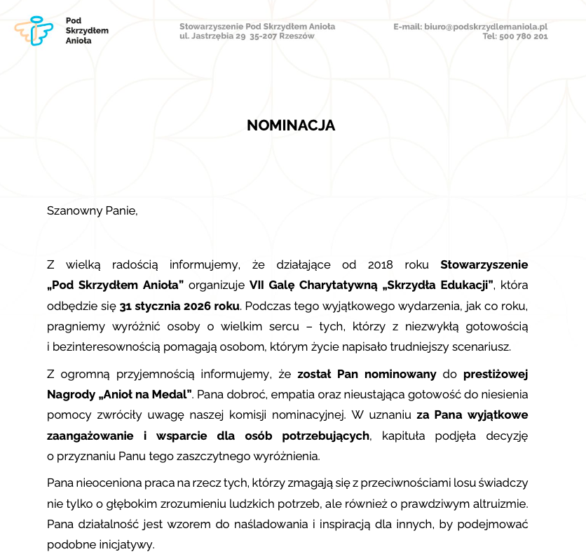 Z ogromną przyjemnością informujemy, że został Pan nominowany do prestiżowej Nagrody „Anioł na Medal”. Pana dobroć, empatia oraz nieustająca gotowość do niesienia pomocy zwróciły uwagę naszej komisji nominacyjnej.